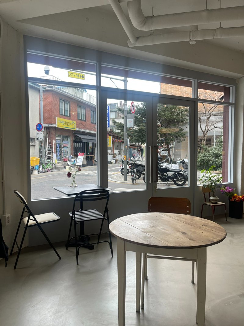 코너 건물 특성상 창가 자리가 많아 자연광이 잘 들어오고, 창문 너머 골목 풍경이 그대로 보여 편안한 분위기를 만들어줍니다. 창가 작은 테이블마다 생화 한 송이씩 꽂아둔 소소한 디테일도 인상적이었습니다.