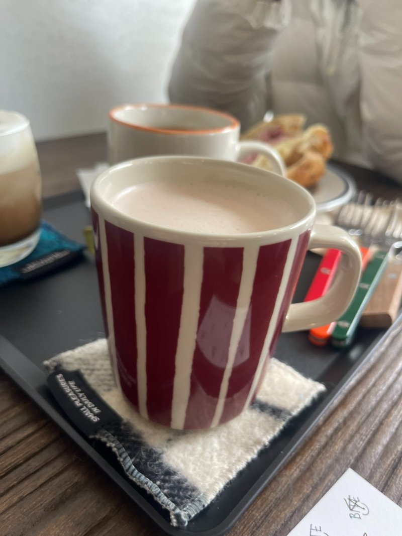 붉은 줄무늬 머그컵, 손뜨개 코스터, 컬러풀한 커트러리 세팅까지 소품 하나하나가 카페의 개성을 잘 살려주고 있었습니다.