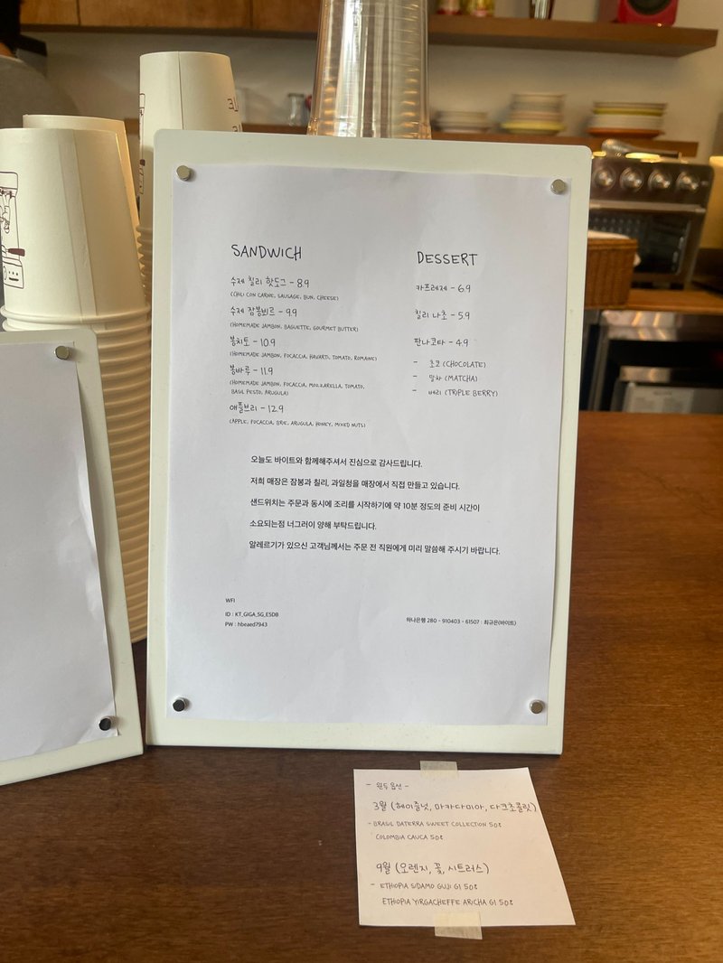 샌드위치는 주문 후 약 10분 소요된다고 메뉴판에 안내되어 있었는데, 실제로도 음료와 샌드위치를 시간을 맞춰 함께 내어주셔서 따로 기다리는 불편 없이 한 번에 받을 수 있었습니다. 이런 세심한 운영 방식이 인상적이었습니다.