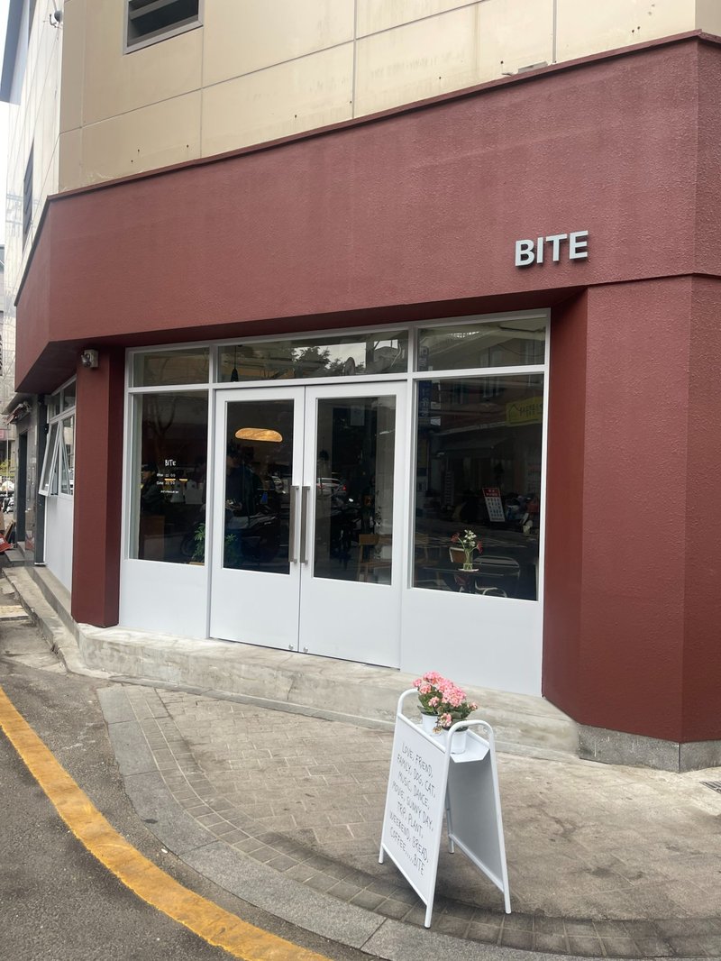 바이트 카페 외관. 다산로42길 코너에 자리한 건물에 BITE 간판이 심플하게 붙어있고, 입구 앞에 흰색 입간판과 꽃이 놓여 있습니다.
