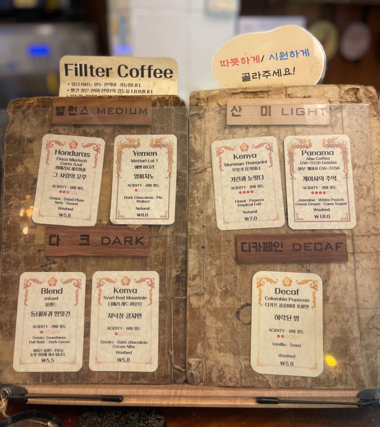 핸드드립 외에도 전통 음료인 쌍화탕과 다양한 디저트 메뉴도 있습니다. 다음 방문 때는 쌍화탕이나 디저트도 꼭 맛보고 싶습니다.